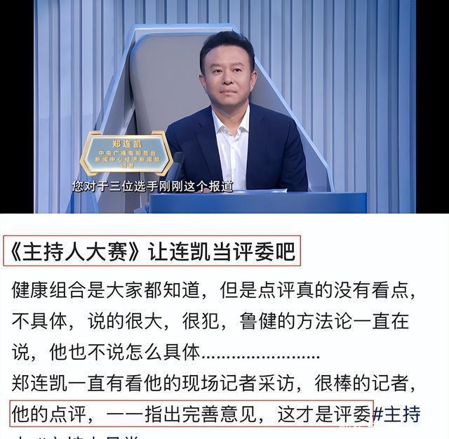 在康辉、鲁健点评结束后, 主持人邹韵突然cue了评审嘉宾郑连凯,让他对选手的表现进行点评。 郑连凯2002年加入央视经济频道,在记者领域摸爬滚打多年,一直做经济新闻报道,如今是中央广播电视总台新闻中心经济新闻部的记者。 郑连凯开门见山,他认为三位选手都非常工整地完成了内容,但新闻要追求极致,所以也一针见血指出了问题。